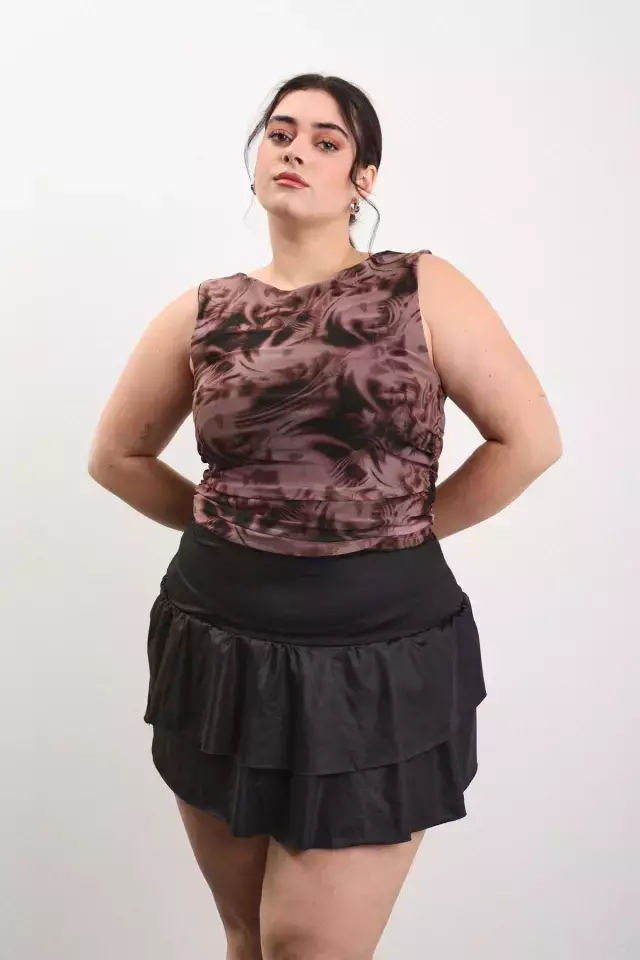 Top de tul sublimado en color rosa combinado con chocolate. Mega cómodo y con forro debajo para que puedas sentirte hiper cómoda al usarlo. Podés combinarlo con nuestra Mini Naria para armar un outfit más para el día o con algún pant, short o mini engomada para elevarlo al máximo y romperla a la noche. Si querés sentirte cool y cómoda a la vez