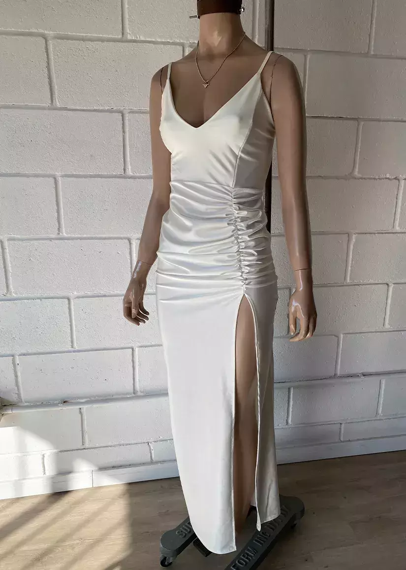 Vestido de microfibra elastizado. Con frunce de frente y tajo.